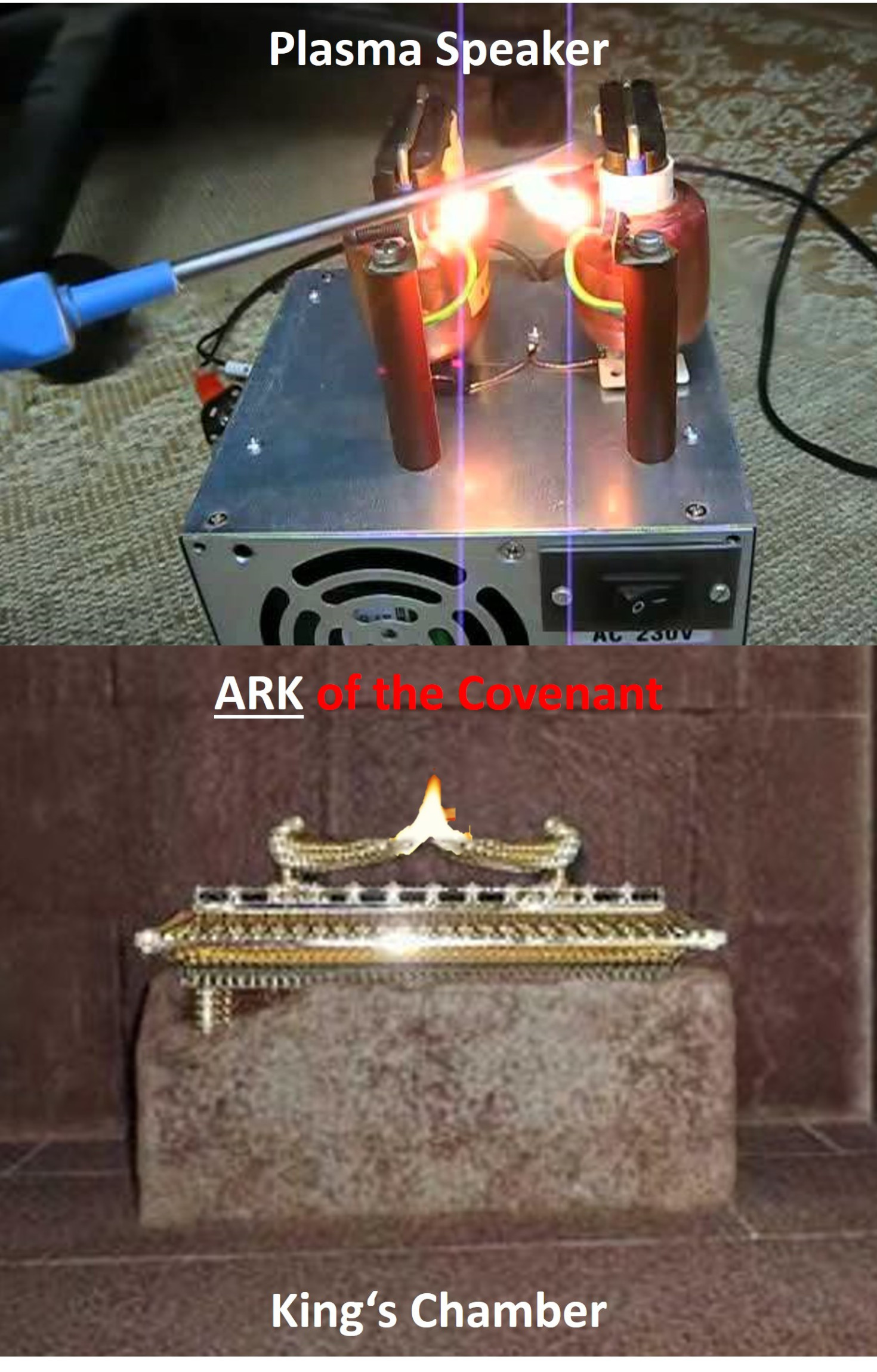 Common sense suggests this device must have had functioned as a Plasmaspeaker. Which makes even greater sense when considered where it originated from. First of all, the dimensions of the Ark of the Covenant perfectly fits into the empty sarcophage of the Great Pyramid of Giza. Secondly Enoch lived before the destruction of Atlantis, thus this device is an Atlantean artifact. Third Cayce describes Atlantis as a globaly established highculture, capabale of hightech achievments like telescopes, lasers and many vehicles such as electric elevators. These records would be found in a hall beneath the right paw of the Sphinx.