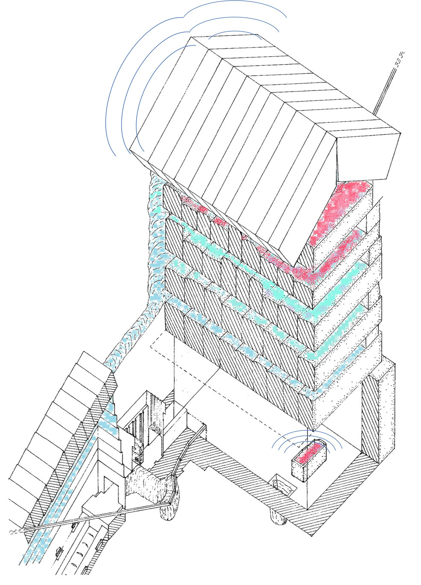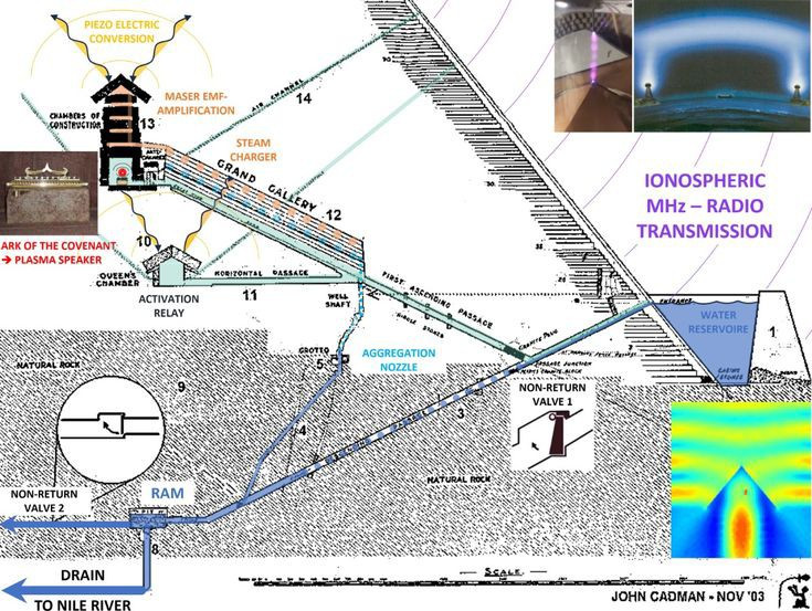 When studying the location, geology, architecture and materials used in the great Pyramid, one inevitably must come to the conclusion that its stone composition was specificly moulded to electrically charge the inner structure while the outermost layer provided insulation, thus it functioned as a capacitor. While the natural frequency of the quarz used maches modern radio frequencies, charging the structure would coincide in emission of these radiowaves while discharging would absorb radiowaves. Experiments have demonstrated the practicable application of this broadcast system, while tesla drew his idea of the Wardenclyffe Tower from his study of the Pyramids.